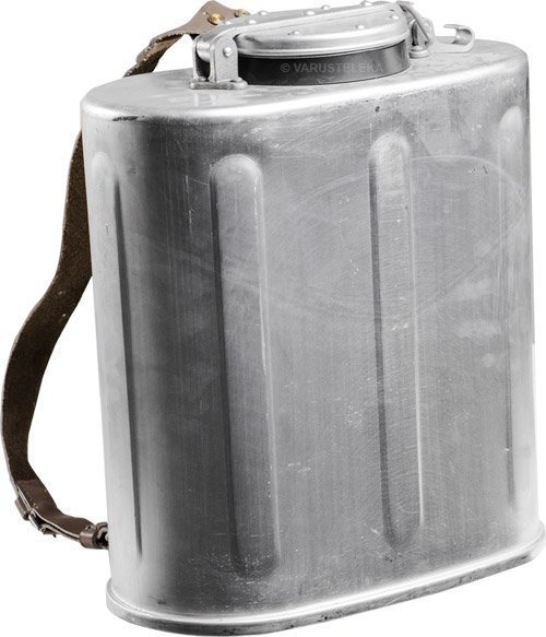 Kun pitää saada lämmintä safkaa tai nestettä paikkaan, johon ei autolla pääse syystä tai toisesta, esim. Mäntsälään, apuun tulee reppumaisesti selässä kannettava termosastia. Nämä ovat italialaista armeijaylijäämää ja saattavat siitä huolimatta jopa toimiakin, vaan emme näitä virallisesti elintarvikeastioina voi myydä. Tämä termosastia on siis metsäänhukkumattoman värinen alumiinipönttö, jonka tuplaseinän sisällä on joko jotain lasin tai muun huonosti kylmää johtavan tapaista eristeenä. Kantohihnat ovat paksua, kestävää vihreätä nahkaa, toiselta puolelta pikairroitettavissa. Tämä on näppärä juttu, kun pönttö pitää saada selästä alas, nopeasti tahi ei. Tiiviste on jotain kumiseosta vuosien takaa, sen koostumuksesta tai spekseistä ja ajan hampaan vaikutuksesta näihin meillä ei ole yhtään mitään tietoa. Äärimitat noin 35 x 43 x 18 cm, paino tyhjänä 4,7 kg. Tilavuuttahan tässä on noin 15 litraa, eli saa tänne aika monen taistelijan sopat. Kunto