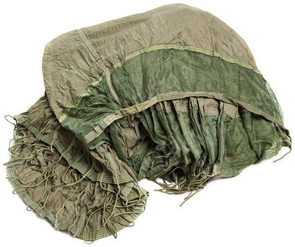 Armeijaylijäämänä laskuvarjot eivät useimmiten täytä turvallisuusmääräyksiä, mutta hyvää materiaalia niissä riittää! Tämä on sotilasvarjon pallomuotoinen kangas, liinat sun muut on leikattu irti, siisti sisustuselementti ja pirun hyvää kangasta kädentaitoisille. Myydään kokonaisena, puolikkaana ja neljännesosana! Näiden varjojen hyppypäivät ovat ohitse, mutta sen sijaan, että olisivat polttouuniin joutuneet on niistä leikattu reppuosat ja narut irti ja myyty pois ylijäämänä. Tämähän on tosi kiva juttu, sillä vaikka laskuvarjolle tulee eläkeikä vastaan, ei materiaali sinänsä mene miksikään. Tämmösestä liki 8 kilon painoisesta pallovarjosta löytyy neliömetreittäin kovalaatuista nylonkangasta, tästä voi askarrella vaikka mitä, erikoista tässä kankaassa on sen paino suhteessa kestävyyteen – kauheasti tätä lujempaa kangasta ei missään inttivarusteissa käytetä! Laskuvarjokankaasta tehdyn takin saa painettua liki nyrkin kokoiseksi mytyksi, täydellistä raaka-ainetta ompelut