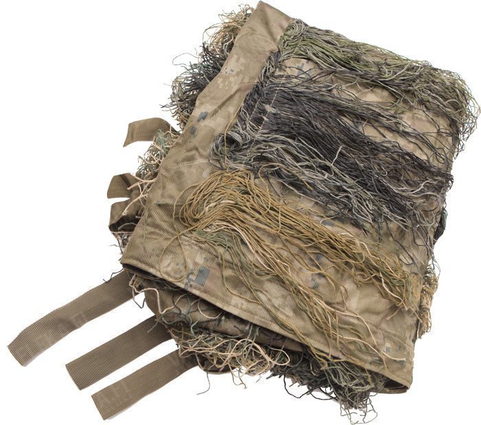 Suorakulmion muotoinen ghilliepeite, jonka reunoilla ja kulmissa sidontanarut. Näillä voi naamioida käyttäjän lisäksi rinkat ja kaikenlaiset muut esineet ja asemat. Narujen ansiosta peite ei lähde tuulen tai kuusenoksien mukaan ja pysyy aina särmästi paikoillaan. Koostuu tiheäsilmäisestä maastokuvioidusta verkkokankaasta, josta roikkuu maastonväristä juuttinarua. Saatavilla kahta kokoa: 140 x 100 cm ja 300 x 200 cm. Tuote on uusi, valmistaja Mil-Tec.