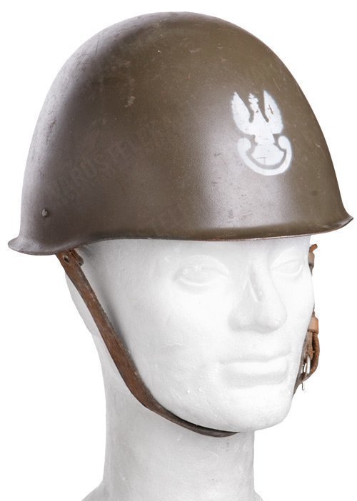 Polakkien visio neukkulaisesta teräskypärästä, sama, mutta vähän eri. Tosi tavanomainen kananmuna nahkasisuksilla, otsassa ”komea” ja ”majesteetillinen” puolamerkki. Eri kokoja ei vissiin ole, ainakaan mitkään merkinnät eivät moiseen viittaa, joten sanotaan näin ympäripyöreästi, että nämä ovat pääsääntöisesti täydellisiä noin 57 kokoiseen päähän, isommille tiukkoja ja pienemmille tilavia. Käytettyjä ja puolalaisia, eli kulumaa ja kuraa voipi löytyä, silti yhä täysin käyttökelpoisessa kunnossa! Käyttö omalla vastuulla, näitä ei nykyään voi myydä mihinkään oikeaan suojaustarkoitukseen.