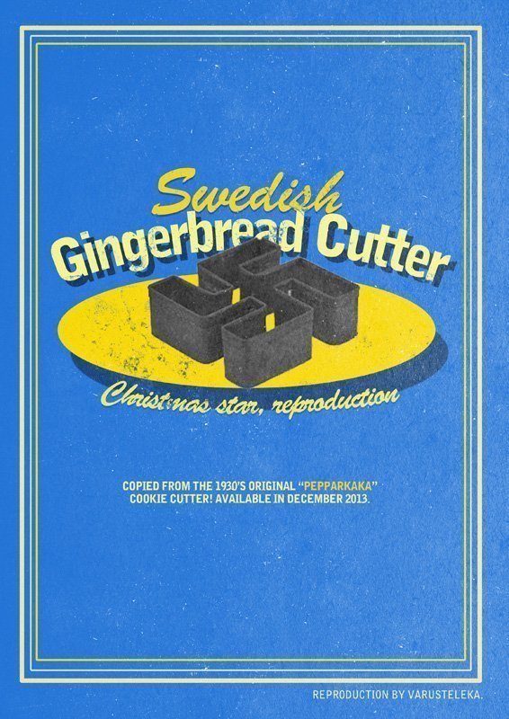 Joskus löytyy helmiä, ja kuten hyppymaihareiden kanssa, aitojen loputtua pitää herättää hyviä malleja henkiin. Ostettiin kerran (tai parikin) täysi puoliperävaunu ruotsalaista ylijäämää. Hyvin iso osa piti heittää pois, pitkät kalsarit meni ihan hyvin kaupaksi, ja sitten jäi vielä ne pari hassua hienoa pikkuesinettä, joita tuli niin vähän, etteivät ehtineet myyntiin asti ollenkaan. Yksi näistä oli aito ruotsalainen joulutähden muotoinen piparkakkumuotti 30-luvulta. Jotta hyvää voisi jatkaa, pistettiin tuotantolinjat jylläämään, ja mikäli kaikki menee hyvin, nämä ovat saatavilla jo jouluna 2013! Joulutähden muotoiset joululeivonnaiset ovat aiheuttaneet jonninverran kohua. Jos joku kuvittelee nyt havaitsevansa jotain raflaavaa, anamme isomman auktoriteetin puhua puolestamme: Ei ole minun ongelmani, jos joku näkee näissä pipareissa jotain muuta, kuin joulutähden. Näin on aina tehty. – Kustaa, Ruotsin ku