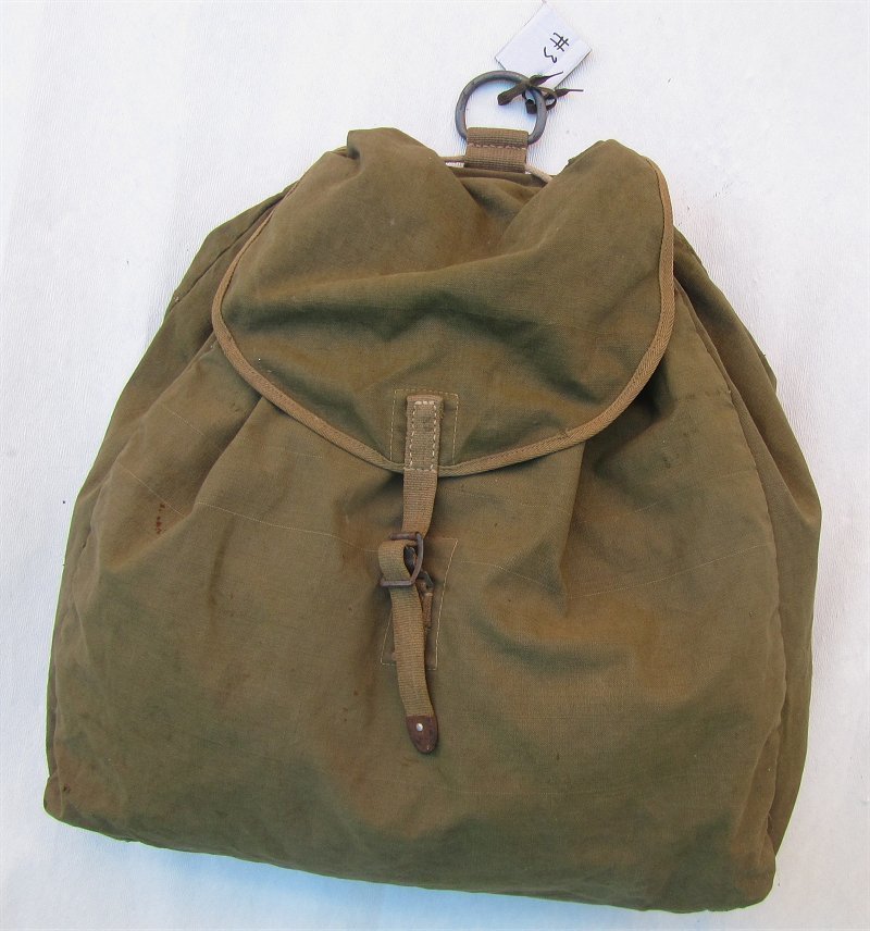 Aito sota-ajan natsien Y-valjaisiin kiinnitettävä selkäreppu, lähes minimaalisilla käytönjäljillä! Käyttäjä on tosin poistanut tästä ylemmät valjaslenkit ja ulkoiset taskut, reppua on selkeästi kannettu jollain muilla remmeillä isosta metallirinkulasta. Laadukkaampaa tuotantoa, tästä ei hohkaa yhtään ”Ersatzin” henki. Kangas on paksua puuvillaa, remmit samaten, alkuperäinen sidontanarukin on tallella. Sisällä yläosassa leima vuodelta 1942. Reppu on niin hyvässä kunnossa, että kehittämällä tähän omatekoiset olkaremmit (kuten varmaan aikoinaan), olis se todennäköisesti ihan käyttökelpoisessa kunnossa – ottaen toki huomioon reippaan 70 vuoden iän.
