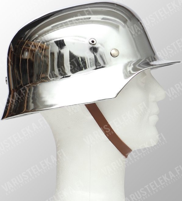 Ihan heti ei tule mieleen asioita, jotka ovat mageempia, kuin saksalainen teräskypärä. Jos nyt ihan pakko on keksiä, niin varmaan huipentumana kukkoilisi saksalainen teräskypärä krominvärisenä. Kai. Tämä kypärä vastaa muodoltaan saksalaisten sodan aikana käyttämää teräskypärää. Se ei ole kuitenkaan Feldgrau, se ei ole Afrika Korps Gelb, eikä tämmösiä kypäriä saleen killunut sakemannien päiden yllä sodan aikana. Kypärässä on peilikirkas kromivärjäys niittejä myöten. Kypärän sisäosat ja leukahihna ovat luonnollisesti nahkaa. Kromipinnassa saattaa olla satunnaisesti pieniä ”kuluma”jälkiä, jotka eivät sentäs meidän varastoissamme ole muodostuneet – syytämme saksalaisia tai huolimattomia valmistajia! Krominvärinen teräskypärä on oiva sadehattu, pyöräilypäähine, kesähattu, talvihattu tai seinäkoriste. Lisäksi se sopii erinomaisesti puvun ja kravatin kaveriksi. Vain yhtä kokoa: noin 59-61. Tuote on uusi.