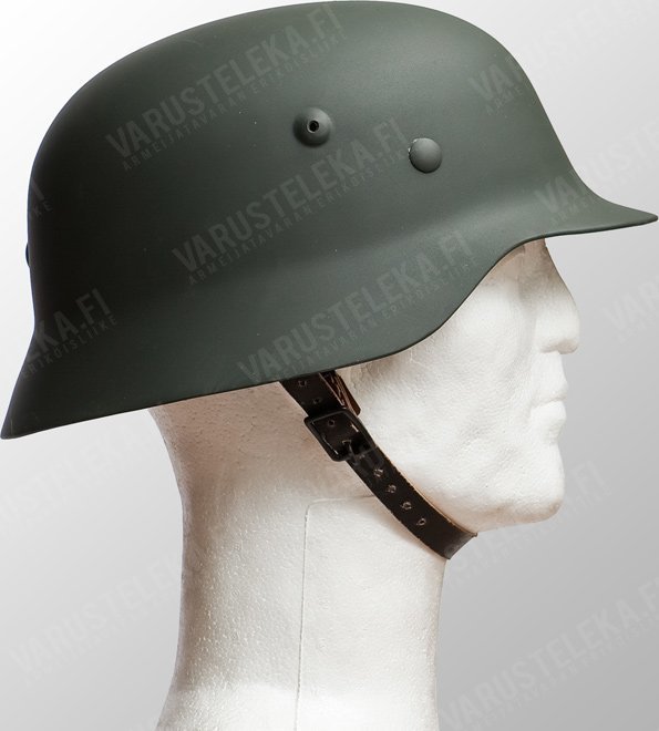 Saksalainen teräskypärä mallia 1935 oli käytössä Saksan kaikilla asevoimilla koko viime sodan ajan, sekä lisäksi suurissa määrin myös Suomen armeijalla. Kypärä koostuu teräskuoresta ja siihen niitatusta sisuksesta. Sisus koostuu alumiinipannasta ja nahkaisesta pääkupista, välissä vähän pehmustetta. Kypärän syvyyttä voi säätää, leveyttä ei. Sisuksin sivuilla on hihnalenkit ja niistä roikkuu nahkainen leukahihna, jonka voi irroittaa ja asettaa eri perin. Tämä uusiotuotanto on tehty teräksestä ja on rakenteeltaan samanlainen kuin sota-ajan kypärä. Sopii erinomaisesti sadehatuksi tai historian elävöittämiseen, aitoja ei kannata käyttöön ottaa – jos ei tunnearvon takia, niin ainakin sen takia, että niistä saa ihan hirveet hillot kun ne myy. Saksalaisilla oli kypäristä noin miljoona eri kokoa. Reprovalmistaja tekee kahta kokoa. Koko on ilmoitettu senttimetreistä. Oikean koon joko tietää tai ottaa selville mittaamalla päänsä ympäryksen 2cm korvan yläpuolelta.